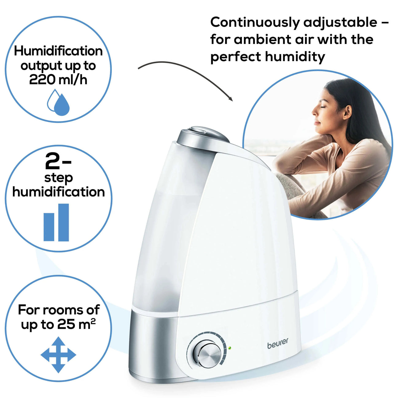 Continuously adjustable air humidifier with removable 2.8-l water tank up to 25 m²