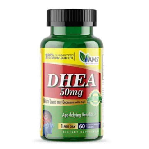 AMS DHEA 50 mg Tablets provide Dehydroepiandrosterone (DHEA), a natural hormone produced by the adrenal glands and a precursor to both male and female sex hormones, including estrogen and testosterone. Supplementing with DHEA may support energy levels, mood balance, sexual health, bone strength, and immune function, especially as natural levels decline with age.