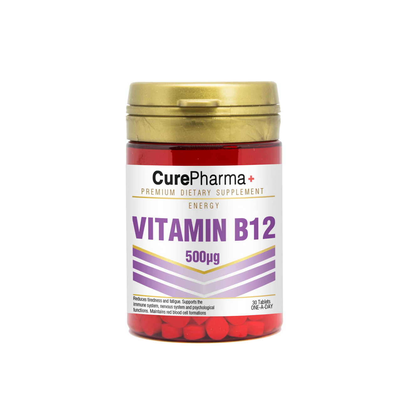 Curepharma vitamin b12 500μg is a premium dietary supplement designed to support energy levels, reduce fatigue, and maintain healthy nervous system function. Each bottle contains 30 tablets with a convenient one-a-day dosage format. This supplement helps maintain red blood cell formation and supports the immune system, nervous system, and psychological functions. The 500μg dosage is formulated to help prevent vitamin b12 deficiency and promote overall wellbeing. The product comes in an easy-to-use tablet form with a 30-day supply when taken as directed. As with any supplement, consult healthcare provider before use, especially if pregnant, nursing, or taking medications.
