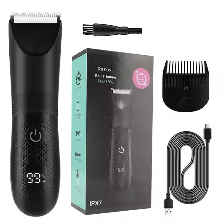 The Resuxi Ball Trimmer IPX7 Model 987 is a waterproof body grooming device designed for precise and comfortable trimming. This rechargeable trimmer features an LED display, ergonomic design, and comes with multiple attachments for versatile grooming needs. Key features: • IPX7 waterproof rating for wet/dry use • LED display shows battery level • Includes attachment combs for different lengths • Rechargeable via USB cable • Ergonomic non-slip grip design • Comes with cleaning brush accessory • Professional-grade stainless steel blades The trimmer comes in sleek black color with a textured grip surface for secure handling. Package includes the main trimmer unit, attachment combs, cleaning brush, and USB charging cable. The IPX7 rating means it can be safely used in the shower and easily cleaned under running water.